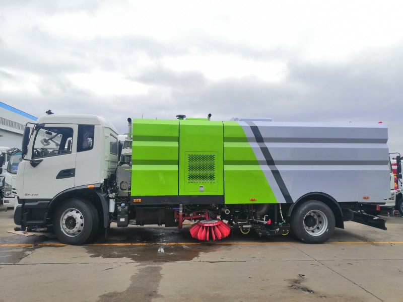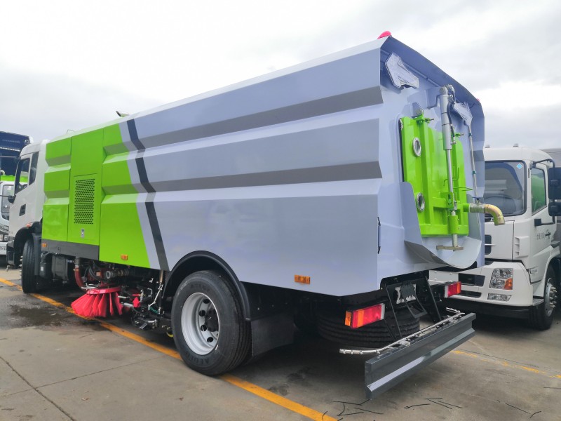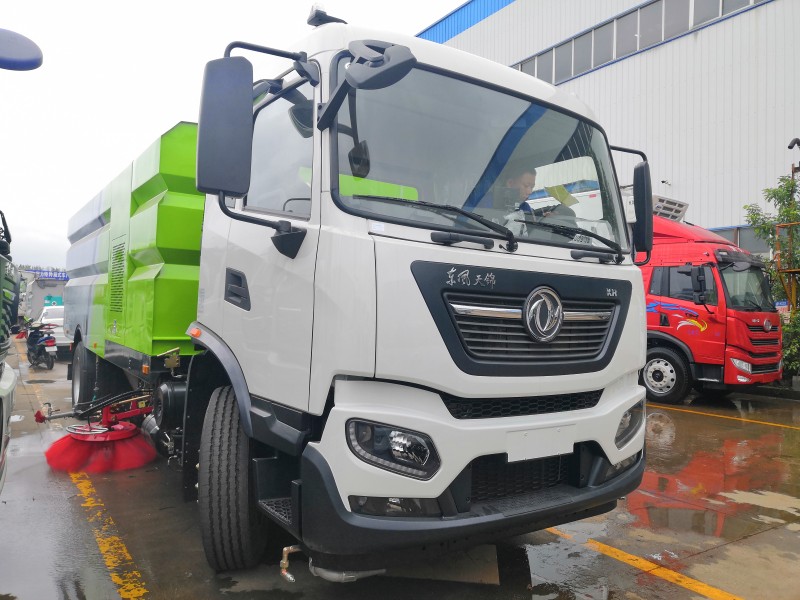 ? 洗掃車采用東風天錦DFH1180EX8型國六二類汽車底盤改裝,加裝副發動機、風機、高壓水泵、清水箱、垃圾箱、左右立掃、帶噴水桿的寬吸嘴、低壓沖洗系統、掃盤降塵系統、液壓系統、專用裝置電控系統和副車架等改裝而成。