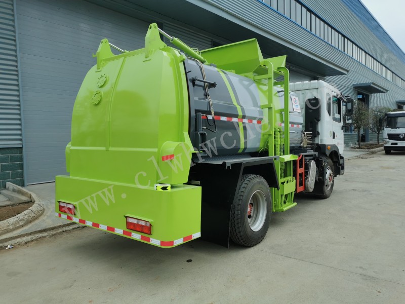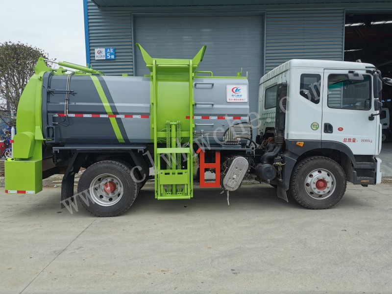 罐體采用4-5mm優(yōu)質(zhì)碳鋼制作,方形罐體,罐體前后封頭采用圓弧蝶形封頭,配拉桿式提升機(jī),可掛120/240升垃圾桶,罐體底部配雙缸液壓舉升自卸,罐體尾門液壓打開和鎖緊+手動(dòng)鎖緊裝置,罐內(nèi)設(shè)固液分離裝置,罐尾設(shè)液體自流閥,液位窗,后門液壓開啟,帶工具箱,洗手裝置。
