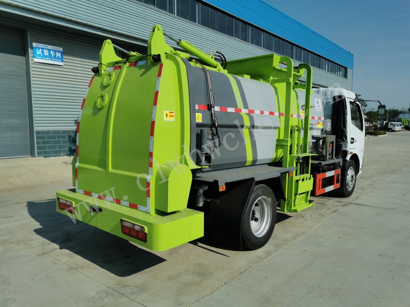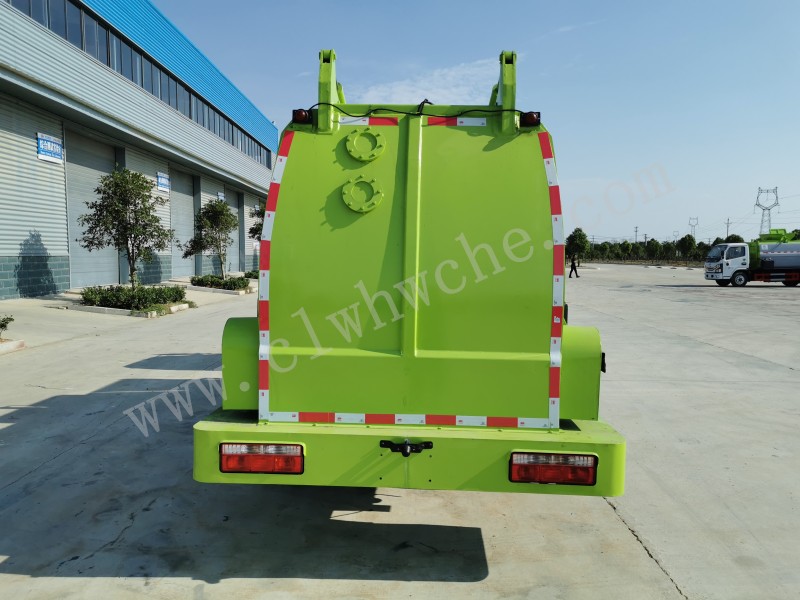 罐體采用4-5mm優質碳鋼制作,方形罐體,罐體前后封頭采用圓弧蝶形封頭,配拉桿式提升機,可掛120/240升垃圾桶,罐體底部配雙缸液壓舉升自卸,罐體尾門液壓打開和鎖緊+手動鎖緊裝置,罐內設固液分離裝置,罐尾設液體自流閥,液位窗,后門液壓開啟,帶工具箱,洗手裝置。