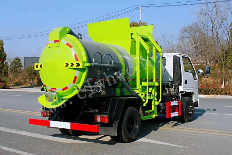 罐體采用4-5mm優(yōu)質(zhì)碳鋼制作,圓罐罐體,罐體前后封頭采用圓弧蝶形封頭,配拉桿式提升機,可掛120/240升垃圾桶,罐體底部配雙缸液壓舉升自卸,罐體尾門液壓打開和鎖緊+手動鎖緊裝置,罐尾設(shè)液體自流閥,液位窗,后門液壓開啟,帶工具箱。