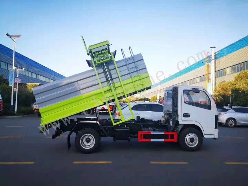 罐體采用4-5mm優質碳鋼制作,方形罐體,罐體前后封頭采用圓弧蝶形封頭,配拉桿式提升機,可掛120/240升垃圾桶,罐體底部配雙缸液壓舉升自卸,罐體尾門液壓打開和鎖緊+手動鎖緊裝置,罐尾設液體自流閥,液位窗,后門液壓開啟,帶工具箱。