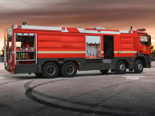 該泡沫消防車,整車主要由梅賽德斯-奔馳 Arocs 4158型消防車專用底盤、**乘員室、水罐、泵室、泵送系統、智能集成**系統、水**、水炮、隨車消防器材以及其他附屬**等組成。整車改裝后載荷分配均勻,質心位置和穩定性計算**,內部空間布局合理,能充分滿足操作人員的使用要求。